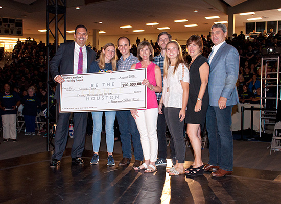 TFA local Executive Director Needham announced the award at Convocation to a surprised Tysor, who was called to the coliseum stage by Dr. Muri who first talked to the crowd proudly about the young Spring Branch ISD grad’s life and career calling.